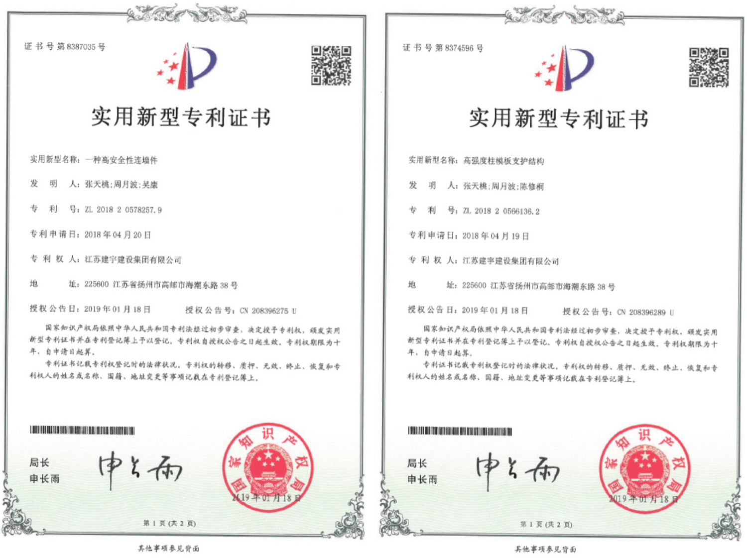 1月29日,從國家知識產權局傳來喜訊,集團公司18年4月份申報的四項“實用新型專利”成果已全部獲批,這是建宇集團第一次獲得國家專利成果,首次申報且同時獲得四個專利給我們帶來了意想不到的喜悅,使參與科技創新的人員備受鼓舞。