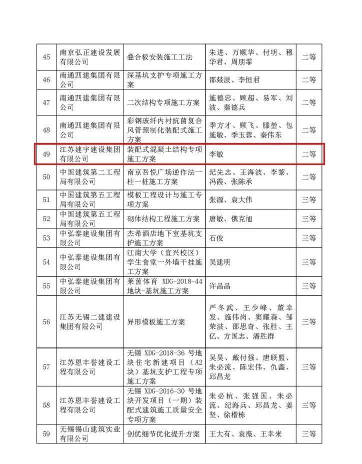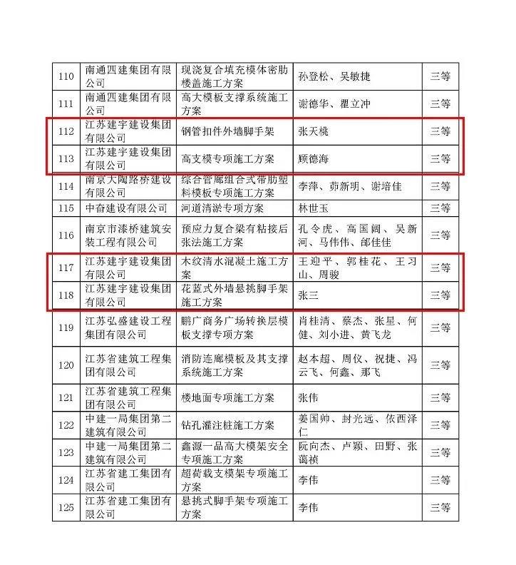 集團(tuán)公司報(bào)送的5項(xiàng)專(zhuān)項(xiàng)施工方案。其中,南京分公司編制的《裝配式混凝土結(jié)構(gòu)專(zhuān)項(xiàng)施工方案》獲評(píng)二等獎(jiǎng),《鋼管扣件外墻腳手架》、《高支模專(zhuān)項(xiàng)施工方案》獲評(píng)三等獎(jiǎng);高郵分公司編制的《木紋清水混凝土施工方案》、《花籃式外墻懸挑腳手架施工方案》獲評(píng)三等獎(jiǎng)。