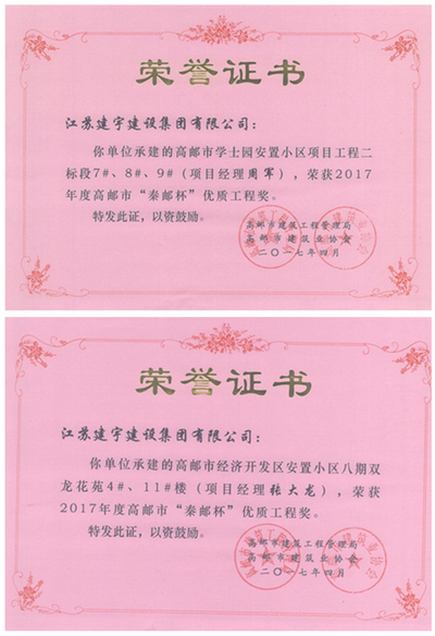 由高郵市建筑工程管理局和高郵市建筑業協會組織的2017年度高郵市“秦郵杯”建筑(裝飾、市政)優質工程評選結果日前揭曉,集團高郵公司承建的“高郵市學士園安置小區項目工程二標段7#、8#、9#樓”和“高郵市經濟開發區安置小區八期雙龍花苑4#、11#樓”兩項工程獲獎。
