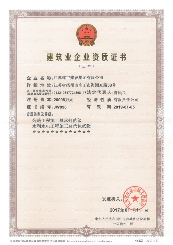 江蘇省住房和城鄉建設廳于2017年1月5日發布公告了第四批獲得建筑業走出去發展扶持資質的企業名單,江蘇建宇建設集團公司順利獲批境外水利水電工程和公路工程總承包二級資質。