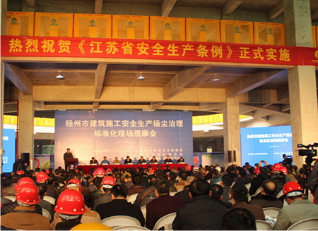 會議傳達學習了習近平總書記、李克強總理關于安全生產重要指示批示精神和國務院、住建部、省、市政府安委辦安全生產電視電話精神;與會人員一起參觀了寶能廣場工地安全生產揚塵治理標準化建設成果。企業代表就安全生產和揚塵治理等好的做法和經驗作交流發言,儀征市副市長李正濤對強化監督管理,嚴格落實揚塵治理各方主體責任等方面的工作進行了表態講話。市城建局局長楊正福最后作總結講話并對相關主管部門及各建筑施工企業提出要求,希望我市城建部門以此次現場會為契機,狠抓行業管理,加強整體聯動,堅持標本兼治,強化督促檢查;各建筑施工企業要提高思想認識,落實主體責任,推進綜合治理,不斷提高我市建筑施工安全生產和揚塵治理工作水平。