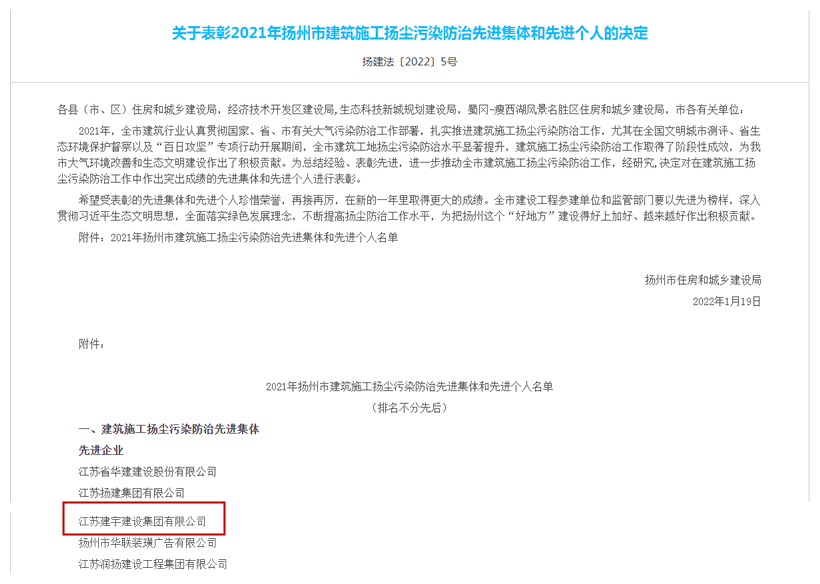 近日,集團被揚州市人民政府評為2021年度揚州市建筑業(yè)先進企業(yè),這是集團第十一次獲此殊榮。同時集團被揚州市住房和城鄉(xiāng)建設(shè)局評為2021年度揚州市建筑施工安全生產(chǎn)先進集體、2021年度揚州市揚塵管理先進單位、2021年度揚州市建設(shè)領(lǐng)域保障農(nóng)民工工資支付工作先進單位。此前,集團還被江蘇省精神文明建設(shè)指導(dǎo)委員會授予“2019-2021年度江蘇省文明單位”稱號。