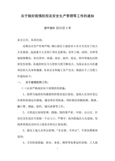 各分公司及時發布各級政府最新的防疫訊息及防控辦法,對所有在建項目提出了疫情防控、安全生產兩不誤的工作布置和具體要求。各項目部也第一時間按照屬地政府和公司要求,加大力度做好防疫工作,并針對辦公區、施工區、生活區展開了地毯式的隱患排查和整改落實。