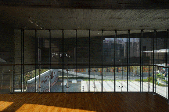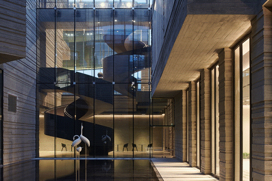 集團成立技術攻關小組,克服施工困難,為達到弧形、凹凸,連續無通縫等各類木紋清水砼表面效果,室內以10cm的統一模數適當弱化肌理,避免喧賓奪主;室外則運用了4cm、6cm、10cm三種模數,在一層為通長的肌理,二層出現長短變化,給人帶來水波蕩漾的意象遐思。