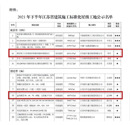 “江蘇省建筑施工標準化星級工地”是由江蘇省住房和城鄉建設廳每年組織評選,旨在表揚全省在安全生產標準化、文明施工管理和揚塵防控工作表現突出的單位,是江蘇省在安全文明施工方面的最高獎項。