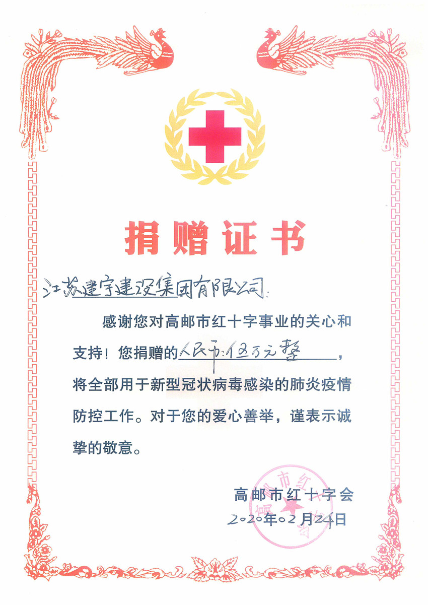 捐贈儀式上,集團(tuán)董事長管民良表示,新冠肺炎疫情牽動著國人的心,建宇集團(tuán)積極參與抗疫,集團(tuán)旗下皇華大酒店堅(jiān)守多日,為市防疫指揮部提供優(yōu)服務(wù);集團(tuán)此前已通過南京市高郵商會等多途徑奉獻(xiàn)愛心,此次再捐贈5萬元用于抗擊新冠肺炎疫情。周鎮(zhèn)長等領(lǐng)導(dǎo)對集團(tuán)的善行義舉和愛心捐贈表示真誠的感謝,并現(xiàn)場頒發(fā)愛心證書,稱贊集團(tuán)此舉是作為市、鎮(zhèn)重點(diǎn)建筑企業(yè)勇于承擔(dān)社會責(zé)任的體現(xiàn)。